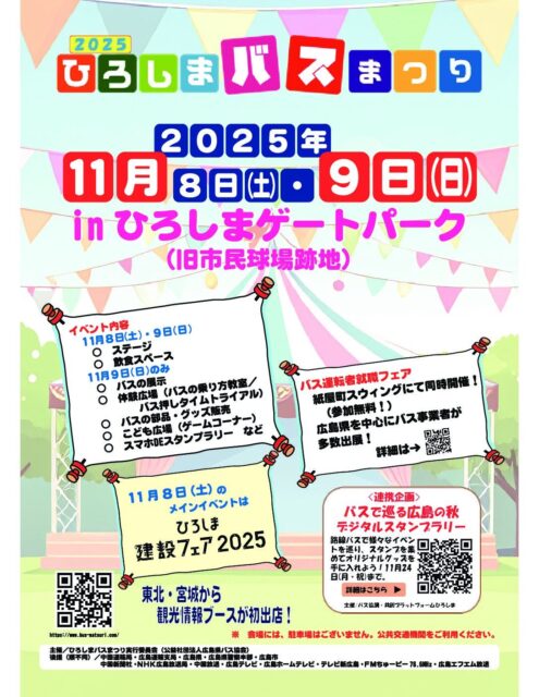 遊びながら建設の仕事を学べる体験型イベント「ひろしま建設フェア2025」が、ひろしまゲートパークで開催!はたらく車の展示・重機の操作体験・どろ団子づくりや壁塗り体験など、子どもたちが実際に手を動かして楽しめる企画が満載です。家族で参加できる人気イベントで、同日には「ひろしまバスまつり2025」も同会場で同時開催されます。